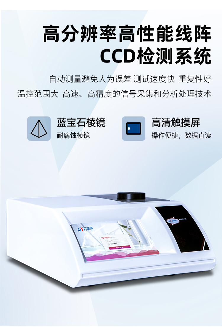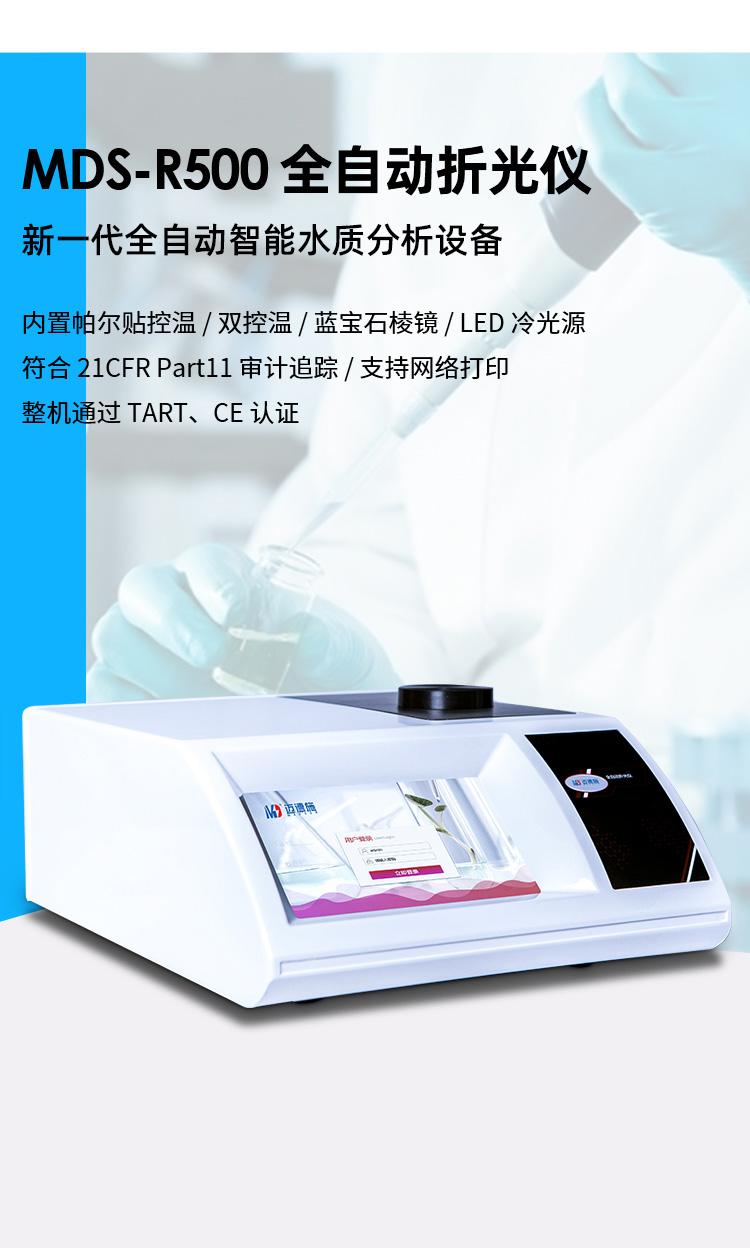 MDS-R系列全自動折光儀配備高性能線陣 CCD 感光部件,通過高速、高精度的信號采集和分析處理技術,配有半導體帕爾貼超級溫度控制系統。能高效、高精確測量透明、半透明、深色、粘稠狀等各類液體的折射率(nD)和糖溶液的質量分數(錘度 Brix)。